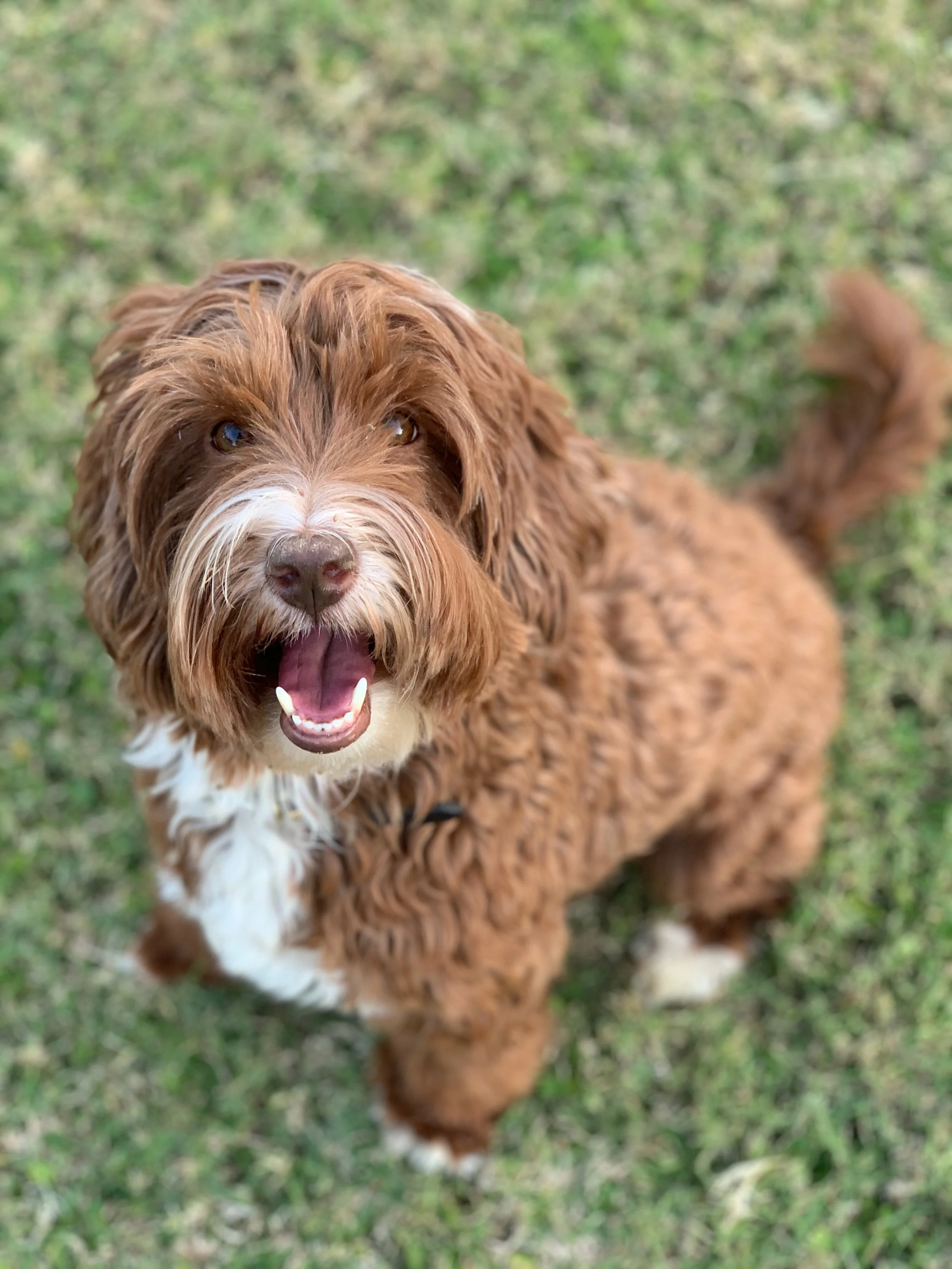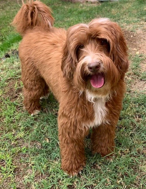 Ohh how we love our sweet Macy girl!!! At only 19lbs and 14 inches at the shoulder she is one of our smallest doods. This pint sized girl has a beautiful dark caramel fleece coat with lots of white, excellent structure and the most stunning copper color eyes. Macy is a cherished family pet and loves to be with her people. Her favorite activities includes chasing balls, playing with her fur friends, going for walks and snuggling with her family. She has passed all her heath testing with flying colors and her first litter turned out amazing.